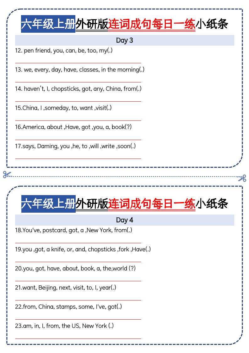 六上外研版三起点英语【连词成句每日一练小纸条】langhun2025-07-04更新关注私信1740六上外研版三起点英语【连词成句每日一练小纸条】此内容为付费资源,请付费后查看20积分自用会员免费副业代理免费登录购买大小381.65 KB页数24类型pdf付费资源 ——预览已结束,还剩22页未读——开通会员后可免费下载高清完整文档 THE END英语 喜欢就支持一下吧点赞0 分享QQ空间微博QQ好友海报分享复制链接收藏