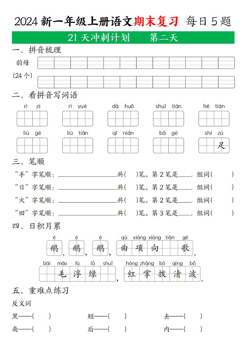一上2024年秋一年级语文上期末复习21天冲刺计划langhun2025-07-04更新关注私信2610一上2024年秋一年级语文上期末复习21天冲刺计划此内容为付费资源,请付费后查看20积分自用会员免费副业代理免费登录购买大小1.62 MB页数21类型pdf付费资源 ——预览已结束,还剩19页未读——开通会员后可免费下载高清完整文档 THE END语文 喜欢就支持一下吧点赞0 分享QQ空间微博QQ好友海报分享复制链接收藏