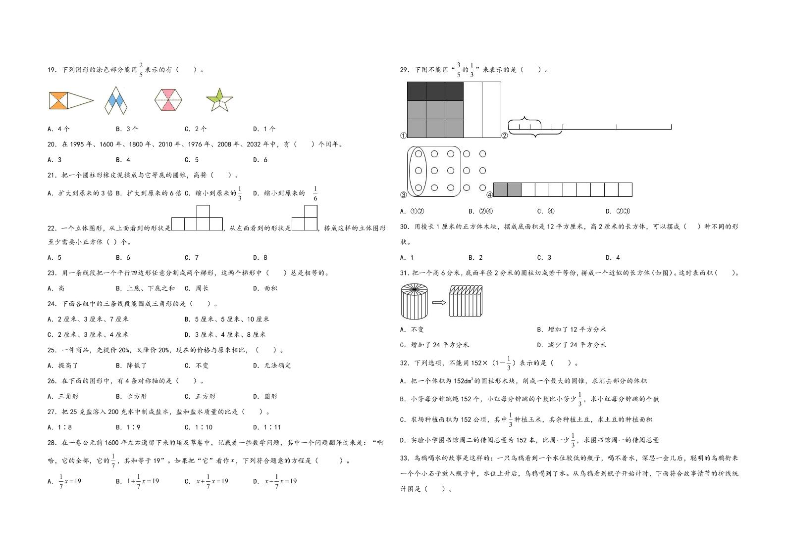六下数学【真题专训】题型一选择题93题(一)-2022年全国小升初真题题型汇编专项训练(人教版)langhun2025-07-04更新关注私信1360六下数学【真题专训】题型一选择题93题(一)-2022年全国小升初真题题型汇编专项训练(人教版)此内容为付费资源,请付费后查看20积分自用会员免费副业代理免费登录购买大小657.72 KB页数24类型pdf付费资源 ——预览已结束,还剩22页未读——开通会员后可免费下载高清完整文档 THE END数学 喜欢就支持一下吧点赞0 分享QQ空间微博QQ好友海报分享复制链接收藏